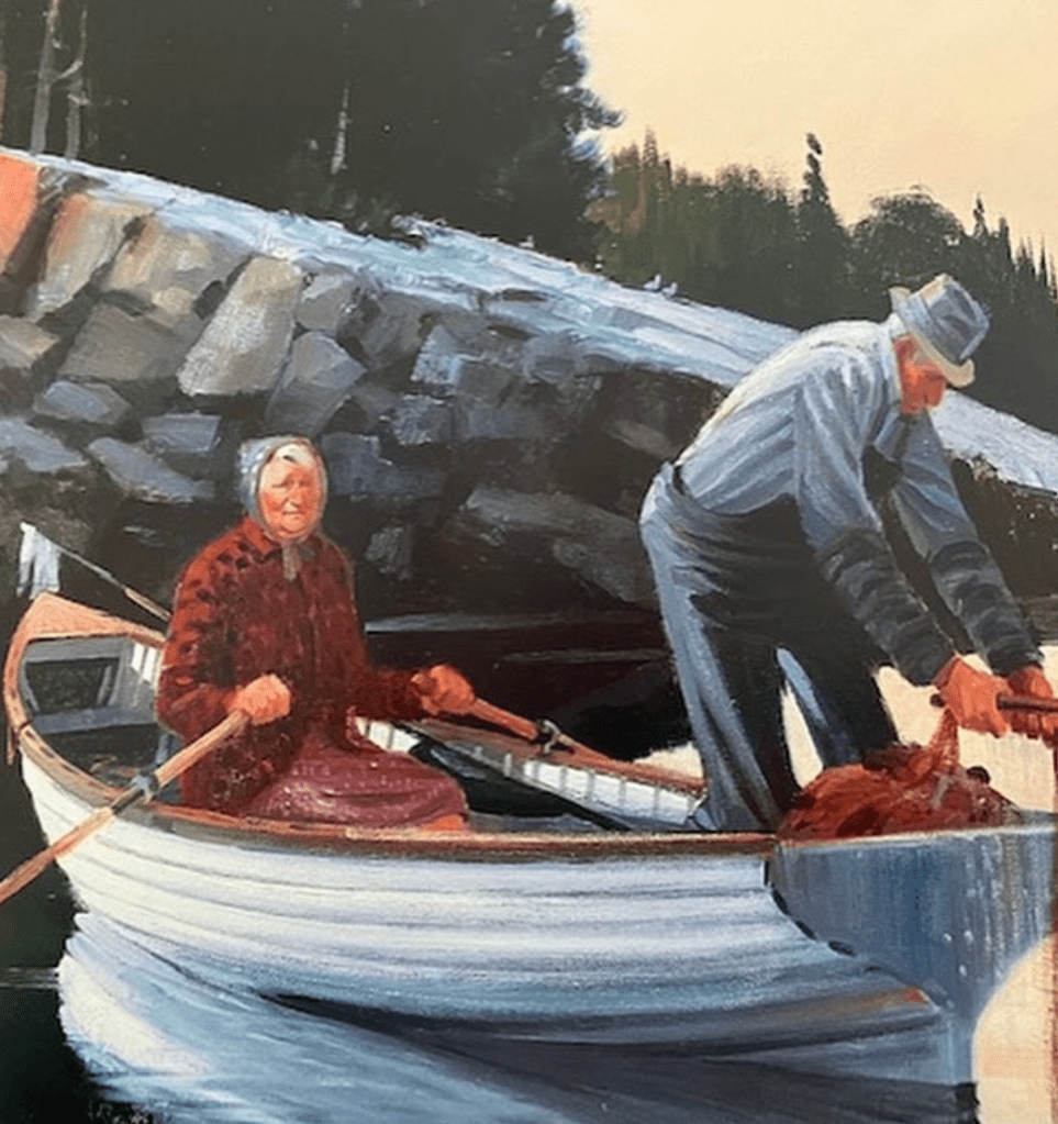 In her later years, T’dora often rowed Sam several miles each day in order to set a few nets and enjoy the familiar rocking motion of the water. Family and friends, children and grandchildren, revolved around T’dora’ caring nature. The coffee pot was always on and visitors were always welcome! Photos from Betty Strom collection. Painting is by Howard Sivertson.