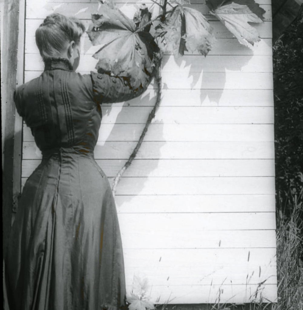 A remarkable photograph of an unknown woman on Isle Royale, elegantly dressed, holding up a large devil’s club specimen that takes center stage against a white wooden cottage as backdrop, might intrigue any viewer. Who was she and what was her purpose on Isle Royale? The artful composition draws one’s eye to the devil’s club suggesting the rare, prickly shrub as the photo’s focus, with the woman, her back to the viewer, as a secondary part of the story. With some creative researching and a bit of luck, Caroline Cooper’s story unfolded, capturing a brief, but impactful Isle Royale experience in the summers of 1909 and 1910.
