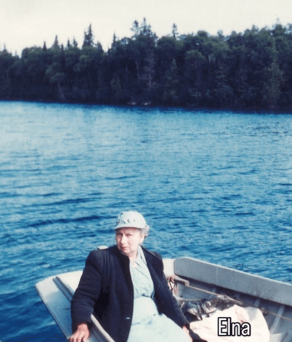 For her wedding present, Elna was given a large kettle to boil water on the wood stove at Johnson Island and spent her honeymoon there. In December of 1926 Elna gave birth to the couple’s first child, Bobby. Bobby would drown in July of 1929 falling off the dock as he ran to greet Emil coming back from fishing.The couple had to wait for the steamer Winyah to make its scheduled stop at Johnson Island to bring him back to Duluth for burial. For their second child, Jim, in 1930 she had Emil build a play pen enclosed with chicken wire so he could not wander down to the docks on his own. In 1936 she welcomed a daughter, Mary Lou, who made her first trip to the island as a baby.